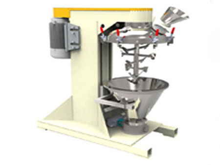 產(chǎn)品通過錐形混合腔頂部投入,投料范圍在30%-100%之間,設備中間有一個頂部驅動的高速轉軸,因此便去除了在產(chǎn)品區(qū)域的密封設計以及軸承。在軸上有緊貼內(nèi)壁的槳式混合原件。通過高速旋轉的攪拌槳和錐形內(nèi)倉的共同作用將產(chǎn)品由底部帶至混合腔的上部。當產(chǎn)品達到頂部的時候又重新回落到混合倉中心,如此的產(chǎn)品的方式形成了一種快速的宏觀混合。