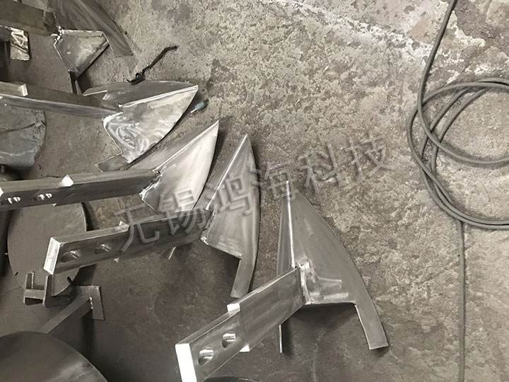混合機(jī)噴液裝置固定在筒體上方,噴嘴采用農(nóng)用噴頭,噴散效果好。