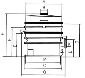 F:第三個出料口離地高度 G:第四個出料口離地高度 K:出料口直徑 M:底座內(nèi)徑N:地腳孔數(shù)及孔徑 Q:出料口間距
